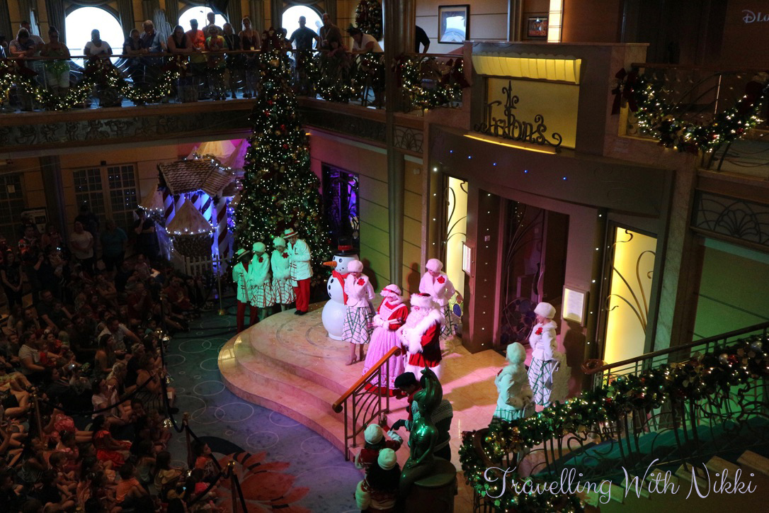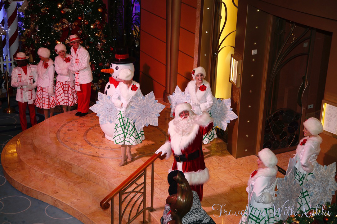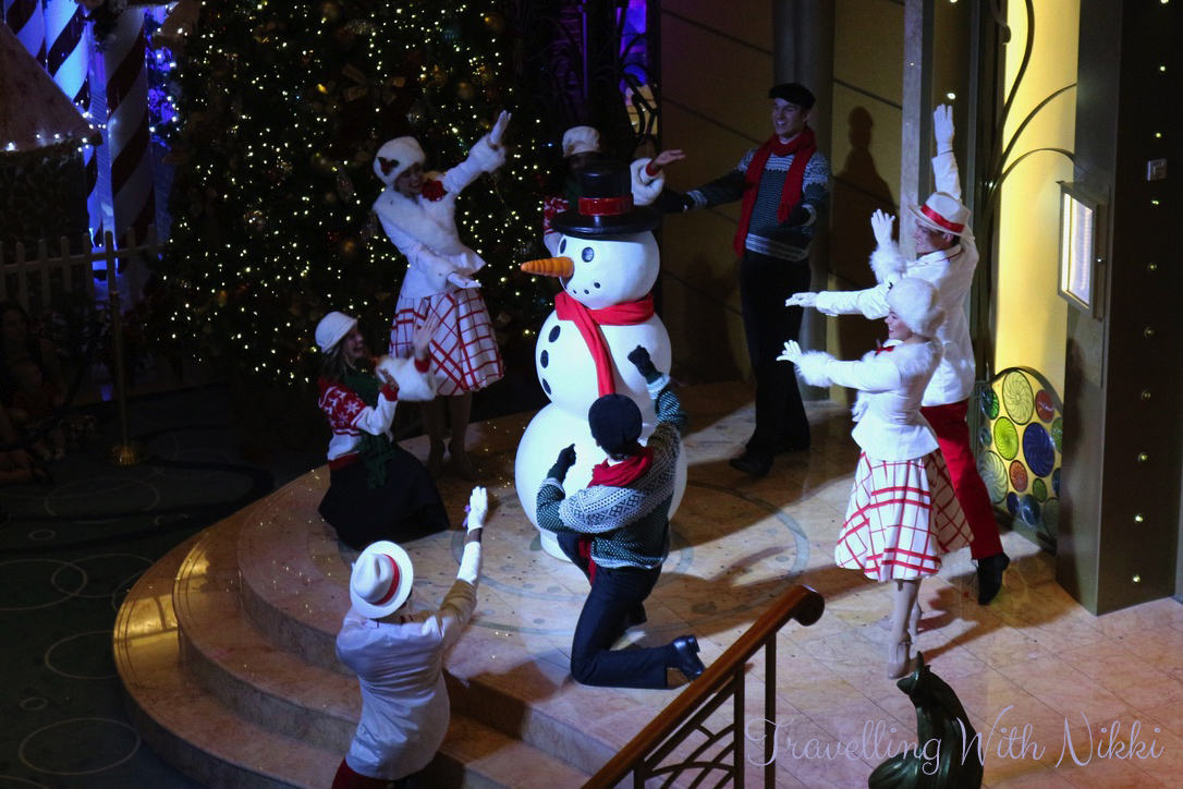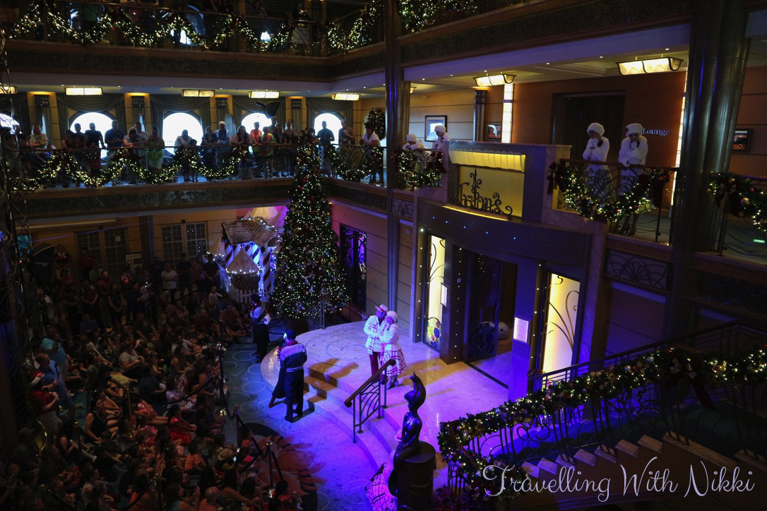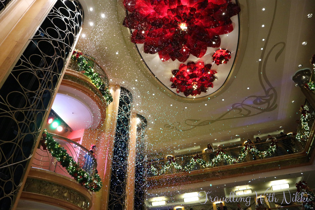 After we had finished our dinner, there was another Santa’s Winter Wonderland Ball in the lobby atrium. We got there about fifteen minutes before it was due to start and once again had no problem getting our normal spot on Deck 4 – Deck 3 was a lot busier but it always is. There also seemed to be a lot more snow than during the afternoon.