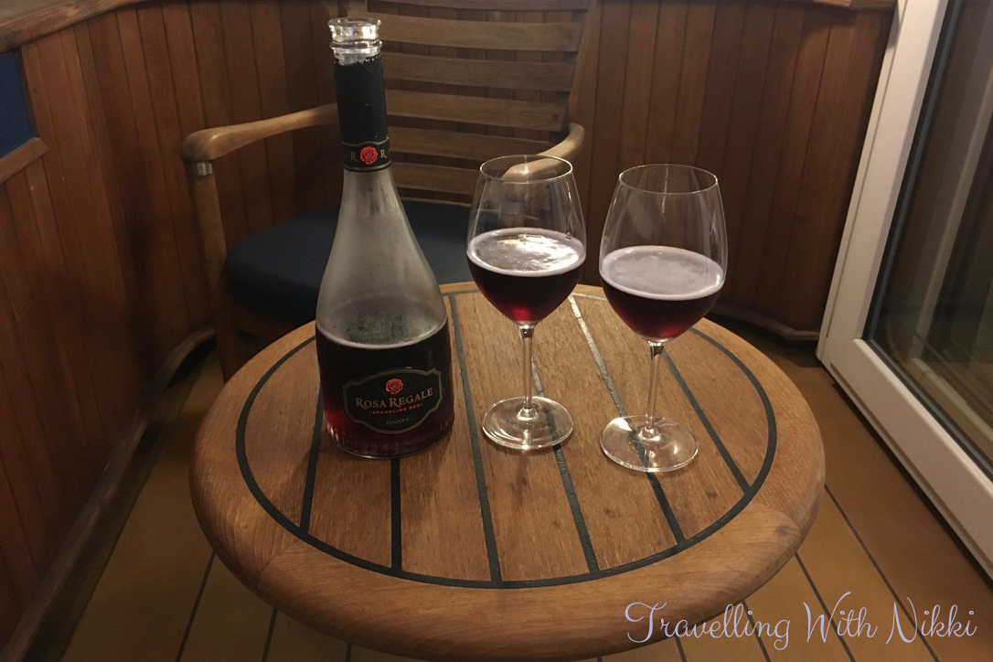 As there were no more characters out until 7:15pm, we headed back to our stateroom to sit on our verandah and watch the sunset with a glass of the Rosa Regale sparkling wine that we had brought onboard with us.