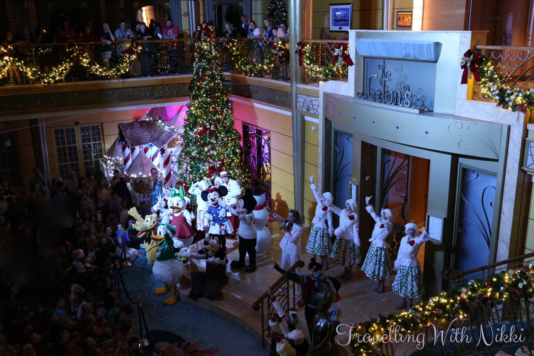 The first of two Santa’s Winter Wonderland Balls was due to start in the lobby atrium at 4:30pm so we headed down to our usual spot on Deck 4 just after 4:00pm and there was only a handful of people there already but we knew it would get a little busier soon once we left Cozumel. We left the dock about five minutes later so I quickly ran outside to take a few photos and I was lucky enough to hear my very first horn battle which naturally, the Disney Wonder won.