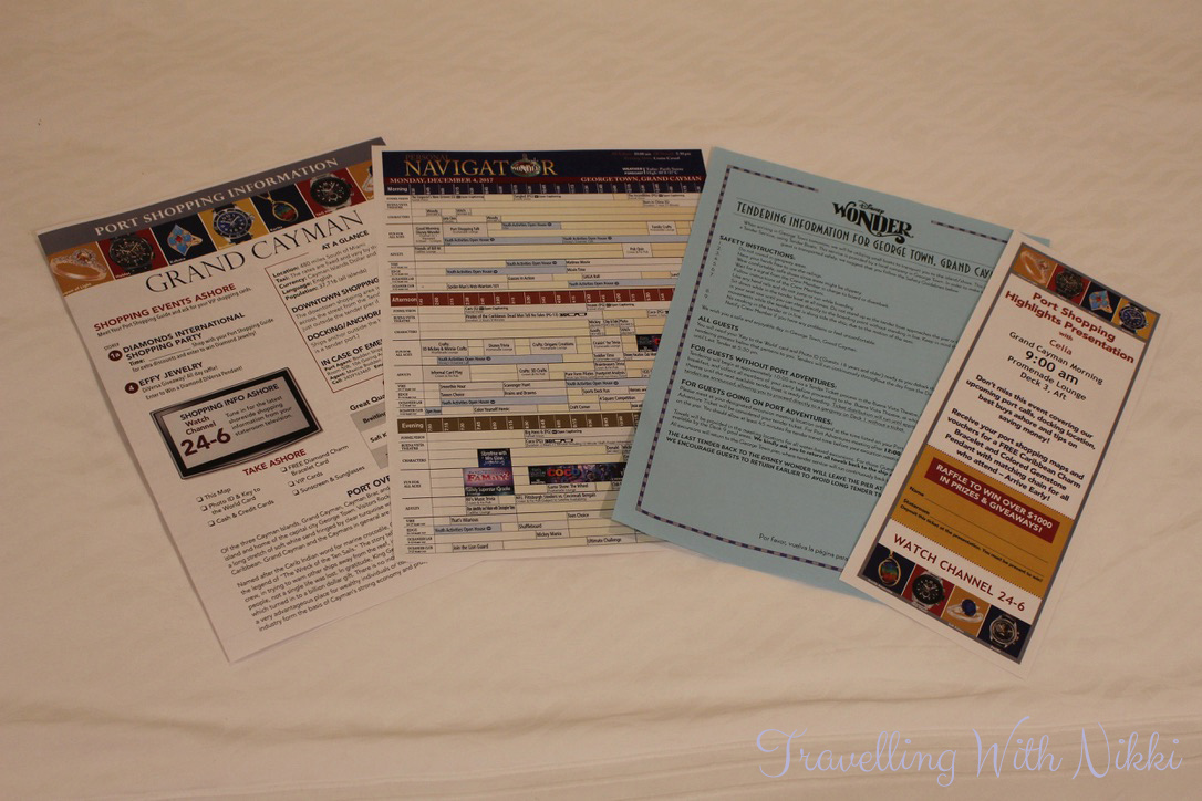 Once I got into bed, I took some time to study the Personal Navigator for the following day as well as read the information about how the tendering process worked at Grand Cayman as we had never tendered before.