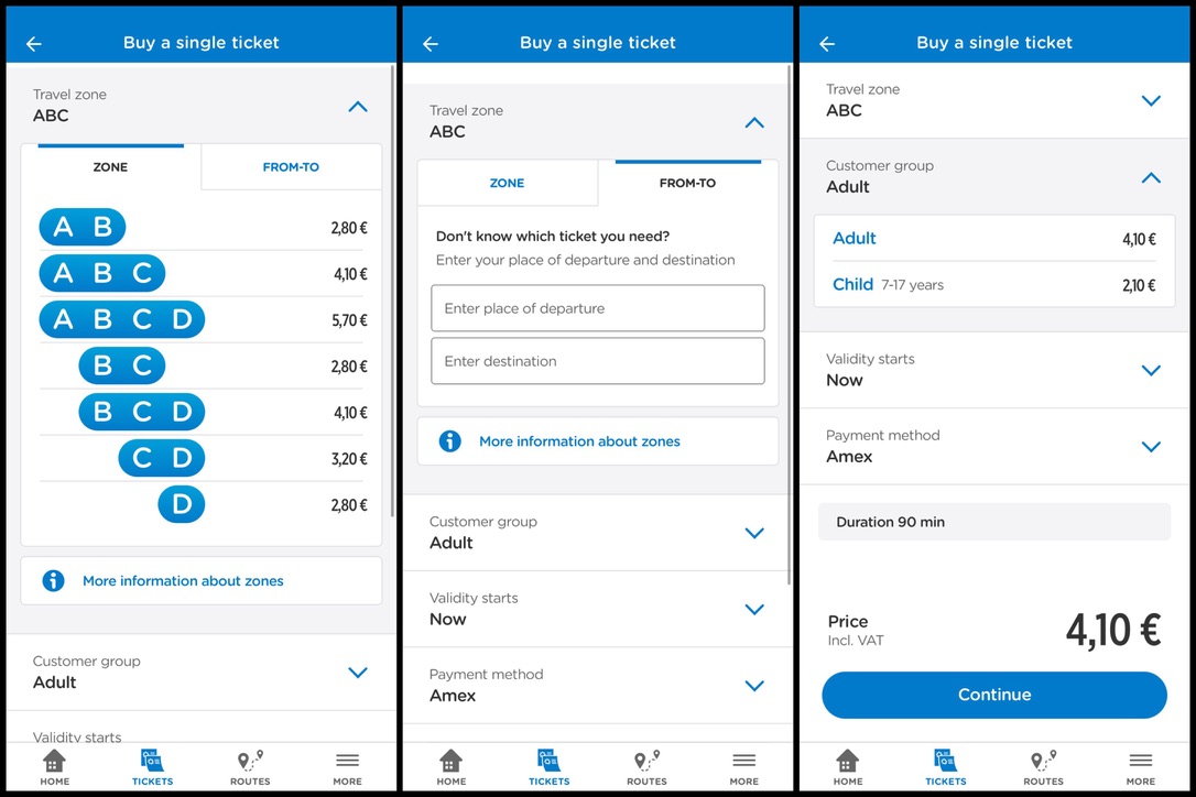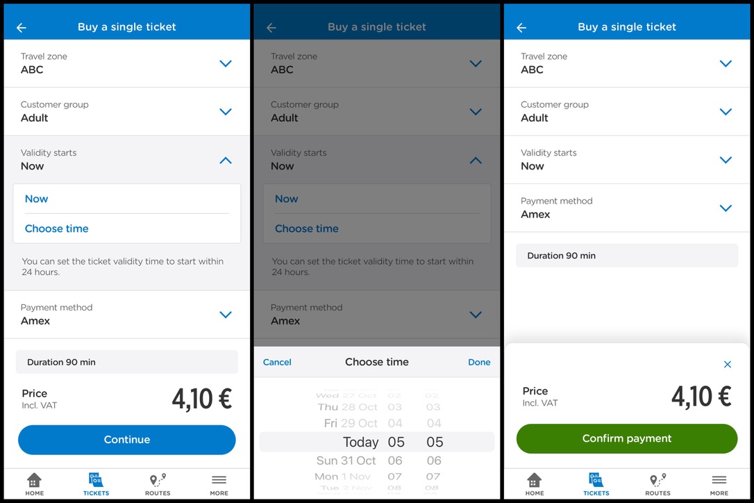 The ticket machines can be used in Finnish as well as in English and Swedish. After selecting which language you want to use on the first screen: