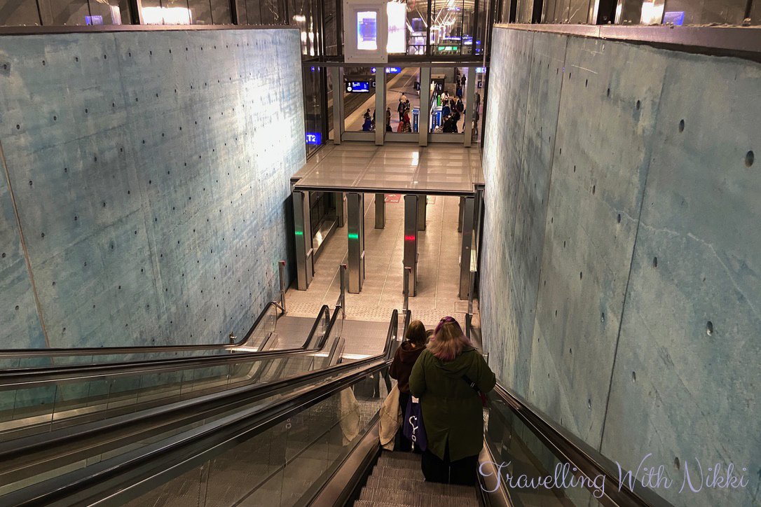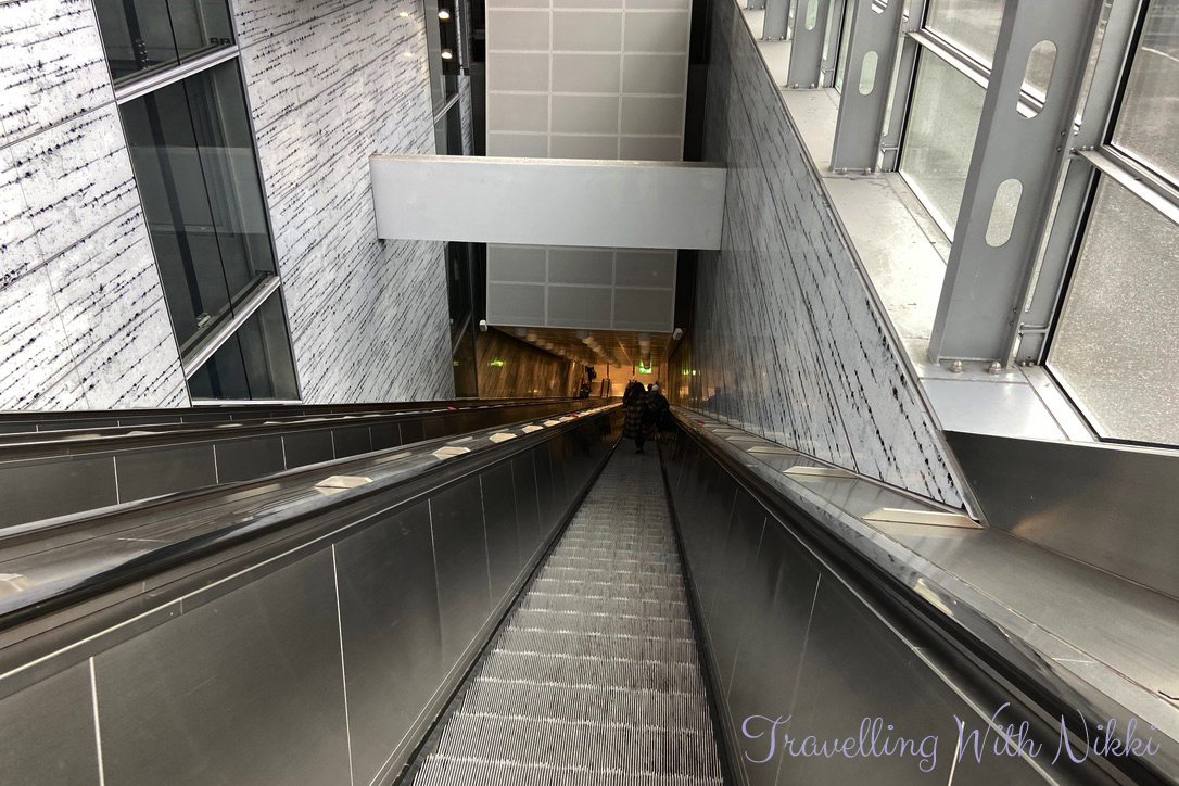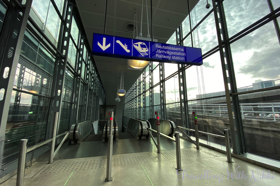 After following the Railway Station / Rautatieasema / Järnvägsstation signs, you will reach a series of two escalators (with a walkway between them) that will take you down to the train station itself. There are also elevators available if you have any larger bags or strollers with you.