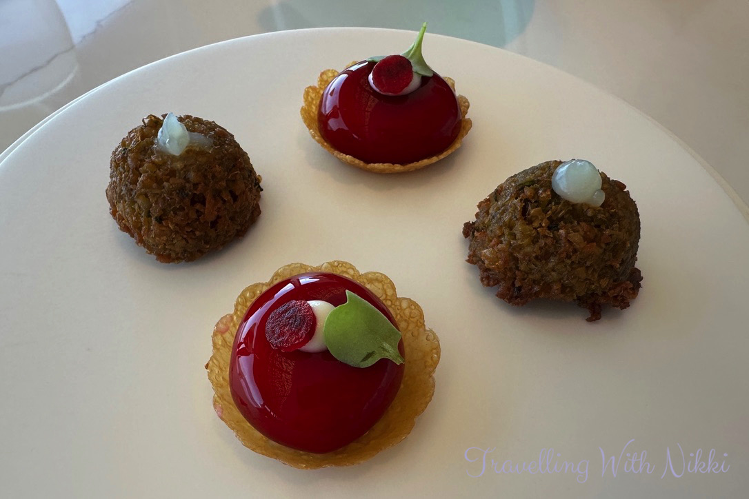 Our dining experience began with our first surprise course which was two canapés each which were a warm falafel with a lemon gel drop on top which was full of so much flavour as well as a horseradish cream topped with beetroot and crème fraîche which was served on a delicate wonton shell.