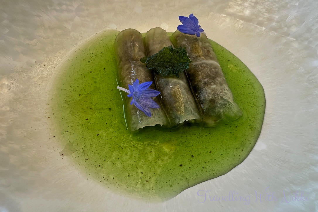 My amuse-bouche arrived shortly afterwards which was pickled daikon radish rolled up and stuffed with courgette (zucchini), mushroom and cucumber and served with a green vegetarian dashi sauce. It was so refreshing and light and the taste was so flavourful for such a small dish.