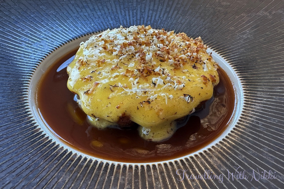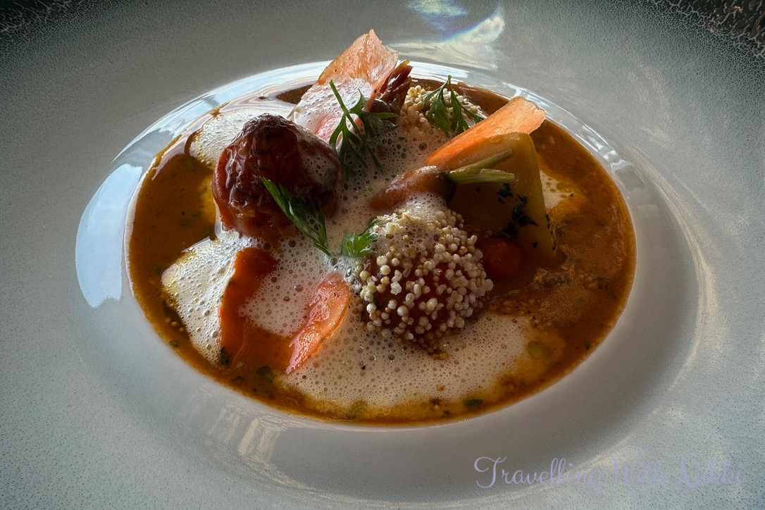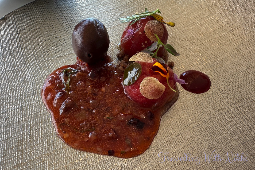 Our first official course was Tomato which consisted of mini tomatoes which had been confit and steamed and filled with a tomato miso alongside a “fake olive” filled with mascarpone (but with no anchovy for me) and covered in olive brine and served with a sauce made of tomato vinaigrette, olives, shallots and lemon. To the side was a focaccia which was made in the same style as a croissant with plenty of butter and served with a different tomato vinaigrette. The final part of this absolutely wonderful dish was a glass of tomato water with tomato water ice cubes which I remember very fondly from our cruise on the Disney Wish and it was still just as good.