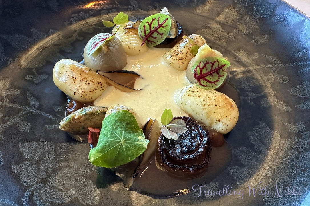 The next course was Baby Carrot and I was served organic baby carrots from the chef’s garden which were cooked in thyme and garlic and served with harissa and carrot condiment which added a touch of spice to the dish. Alongside that was a ravioli with carrot puree inside and a carrot glaze on top and the whole dish was finished with a Coteaux Champenois sauce that was added table side.