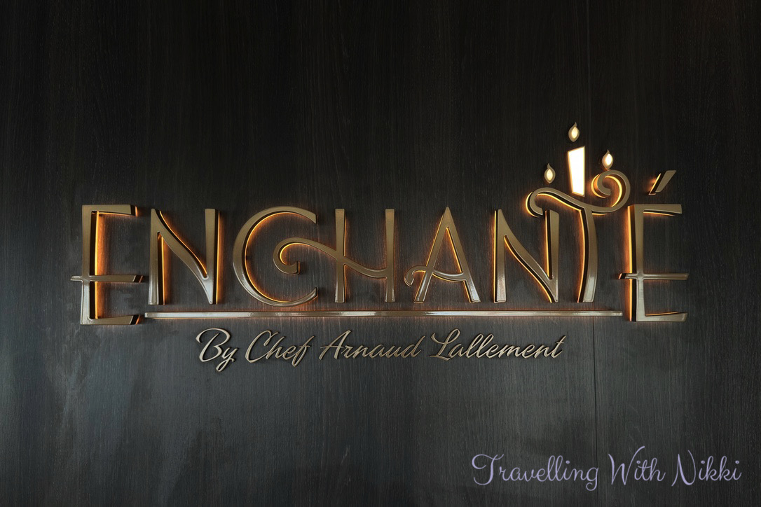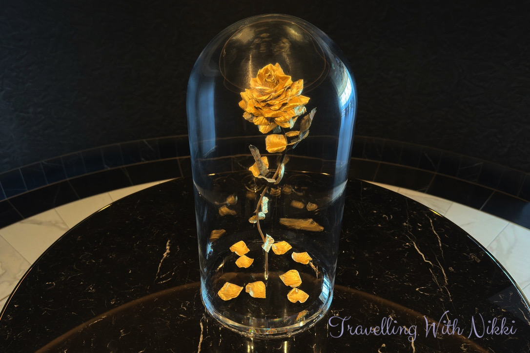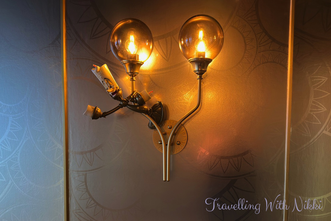 The Rose is inspired by Beauty and the Beast which is one of my favourite films of all time with Enchanté inspired by Lumiere and Palo Steakhouse inspired by Cogsworth. We walked down the long hallway from The Rose that leads to Enchanté and were introduced to maître extraordinaire Lumiere who is hanging from one of the light fixtures and guiding us towards the entrance of Enchanté and I also noticed that you could even see the subtle outline of the plates from Be Our Guest on the walls which I had never spotted before.