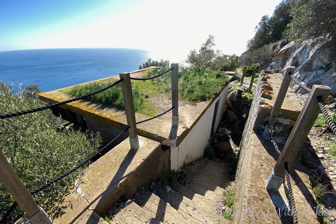 Along the next section of the trail are some old military World War 2 buildings and if you carry on walking (and walk past the path that continues uphill) you will reach a viewing platform that offers incredible views of the Rock and the eastern coastline of Gibraltar as well as La Línea de la Concepción across the border in Spain and the Costa del Sol in the distance. You will then need to backtrack a few steps to continue the walk uphill.