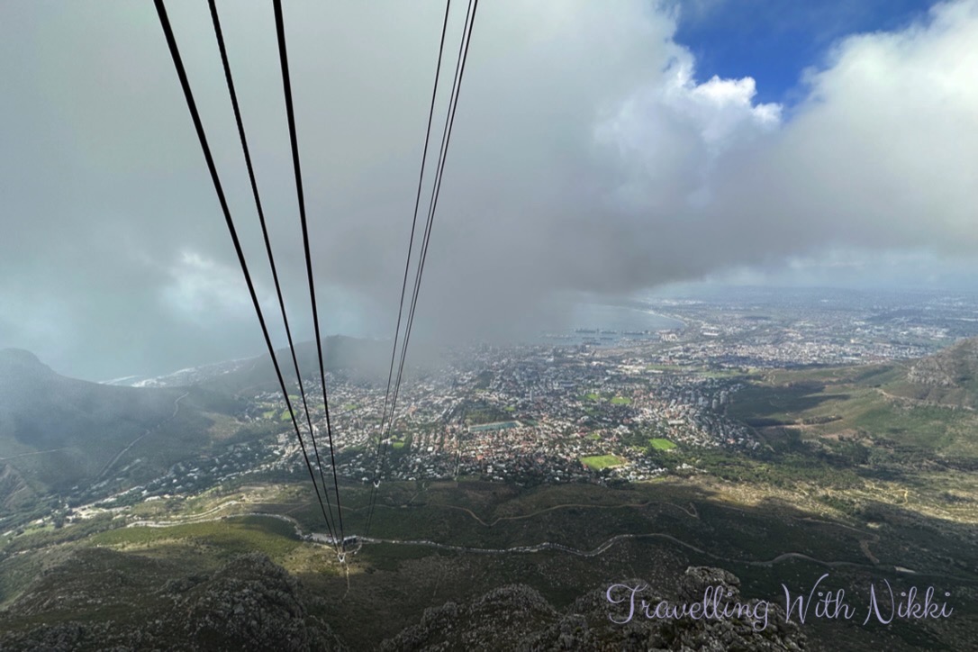 I could have easily waited to see if the clouds would clear but I was absolutely starving and even though there is a cafe that sells both food and drink at the top of Table Mountain, I had walked past a restaurant at the Waterfront the day before which I wanted to visit that afternoon for a late lunch. I was able to buy a ticket for the cable car on my phone and joined a short line to head back down Table Mountain – and the view below as we descended through the clouds was incredible.