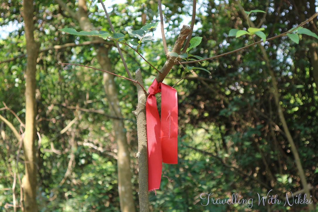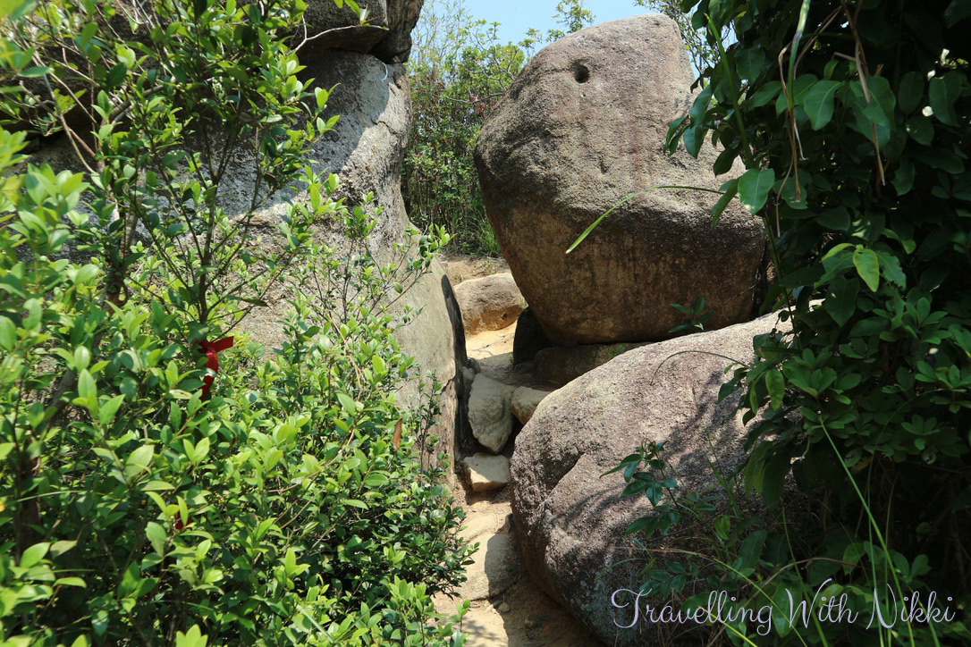 At the junction, turn right and you’ll see a small trail in-between the trees ahead of you – you’ll see red ribbons attached to the branches to guide you in the right direction. Climb up this short trail and you will see some rocks ahead of you – don’t worry as there’s a gap in the rocks you can squeeze through.