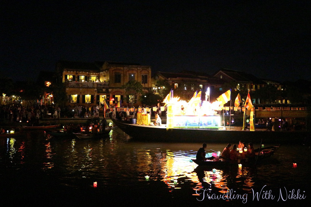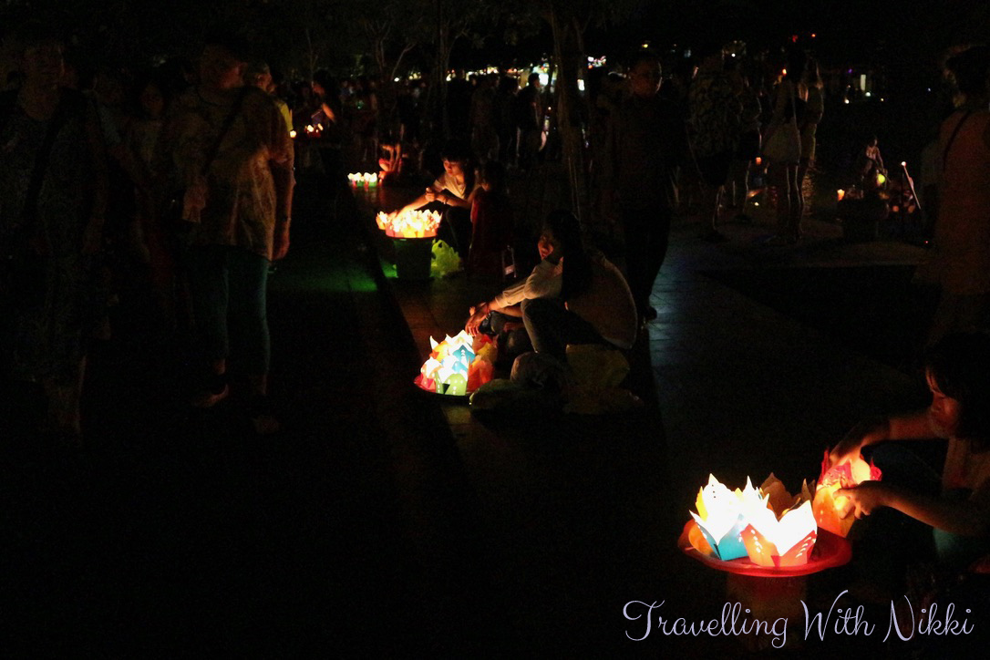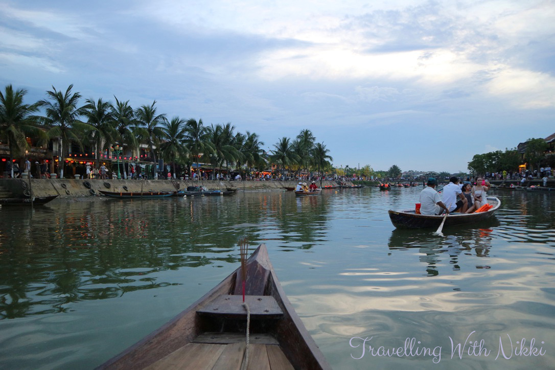 Once we got to the other side of the river, we decided to do the boat ride whilst it was still light and whilst it was still relatively sane. After chatting to a lady who also helped to take some nice photos of us together with one of the huge trays of lanterns, we paid VND200,000 (£6.50/US$8.50) for a twenty minute boat ride with up and down the river with a lantern each. We could have haggled and got it slightly cheaper but to be honest, we did not mind paying that – there comes a time when you realise that it’s not worth arguing over such a small amount of money. The one tip I can give for getting in and out of the boats though is to have flat shoes on such as trainers as it can be quite slippy. There are also lifejackets available on each of the boats if you want to wear them whilst out on the water.