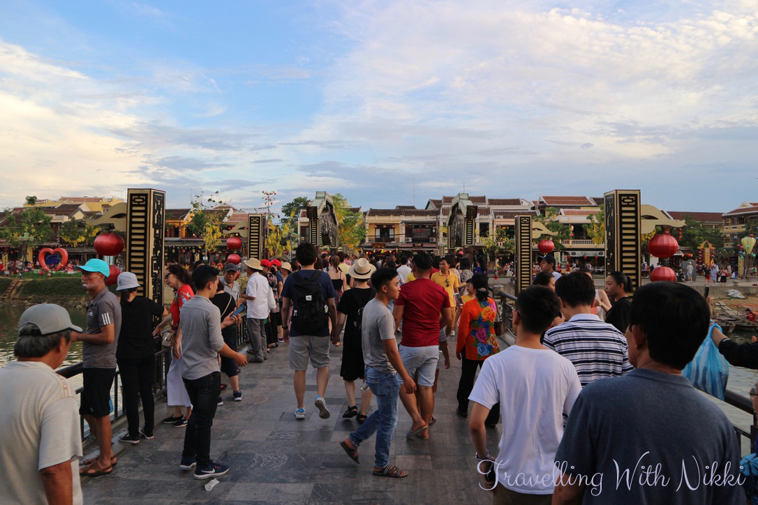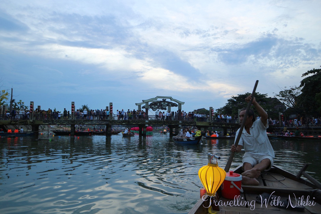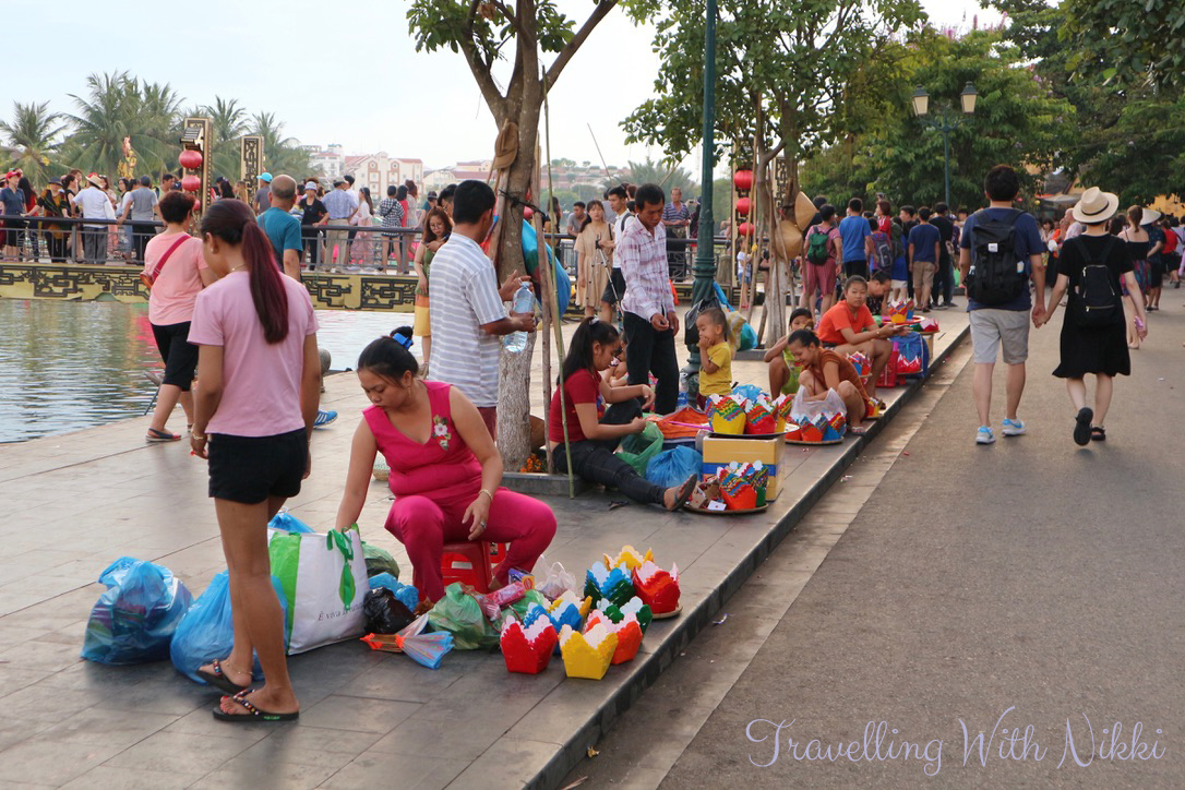 As we reached the banks of the Thu Bon River, we could see a lot more people. Along the banks of the river were people selling souvenirs and lanterns as well as offering boat rides. We were asked constantly if we wanted a boat ride and and the words “no thank you” didn’t always work as they would keep constantly asking until we walked away but later on in the evening (after actually doing the boat ride) we found the key phrase which worked was “we’ve already done it”. The Cau An Hoi Bridge was starting to get busy with people trying to take photos and it only got busier and more crowded as the night went on. A top tip if you want to take your photo on the bridge is to go during the day when the festival is not on as it will be empty then.