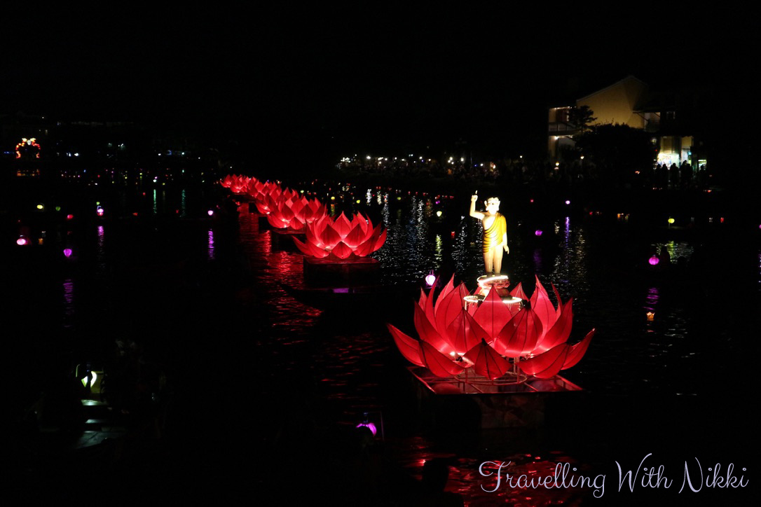 Just after 8:30pm, we heard music and drumming and saw a parade starting to make its way across the Cau An Hoi Bridge and into the streets of Old Town Hoi An in honour of Buddha’s birthday. There was a dancing dragon and several floats with lots of flowers, lights, statues and flags attached to them. If you thought the crowds around the bridge were busy before, they were crazy at this point.