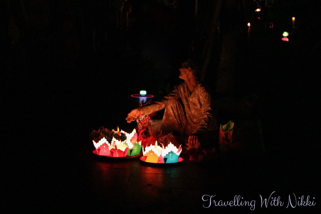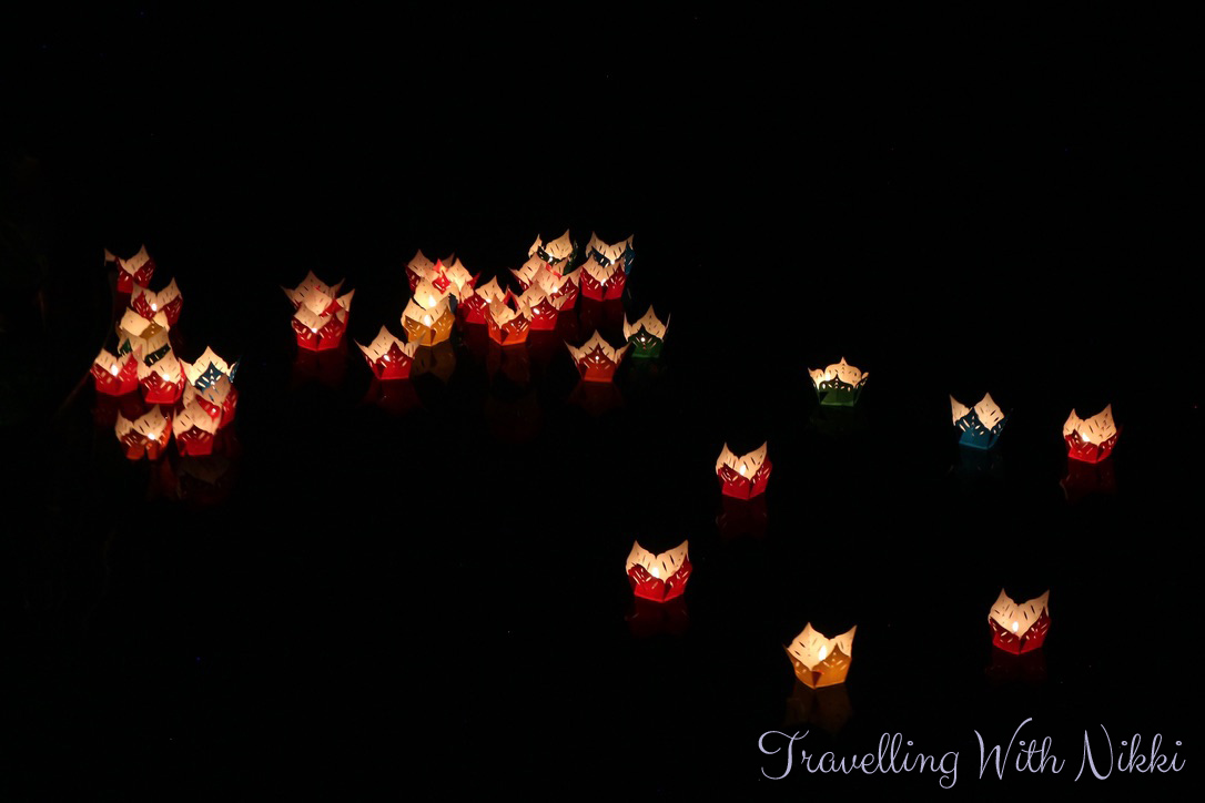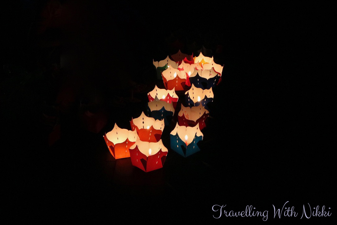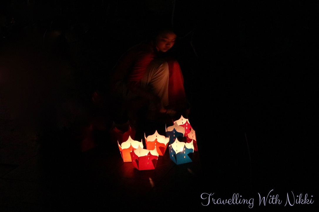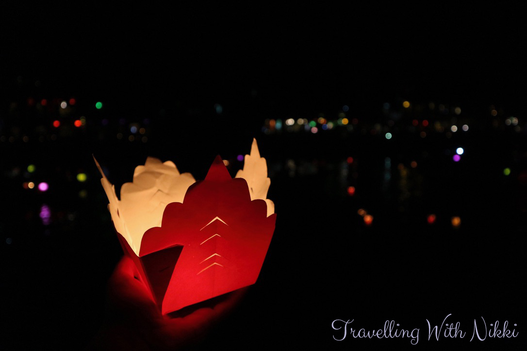 Once you have purchased your lantern, the sellers will hand you a pole with a little basket attached to the end of it so you can lower your lantern into the water and hope that love, luck and happiness will come your way. Despite the slight guilt I felt at putting more lanterns (and therefore more waste) into the river, watching the hundreds of colourful lanterns floating in the darkness on the river was truly a magical sight.