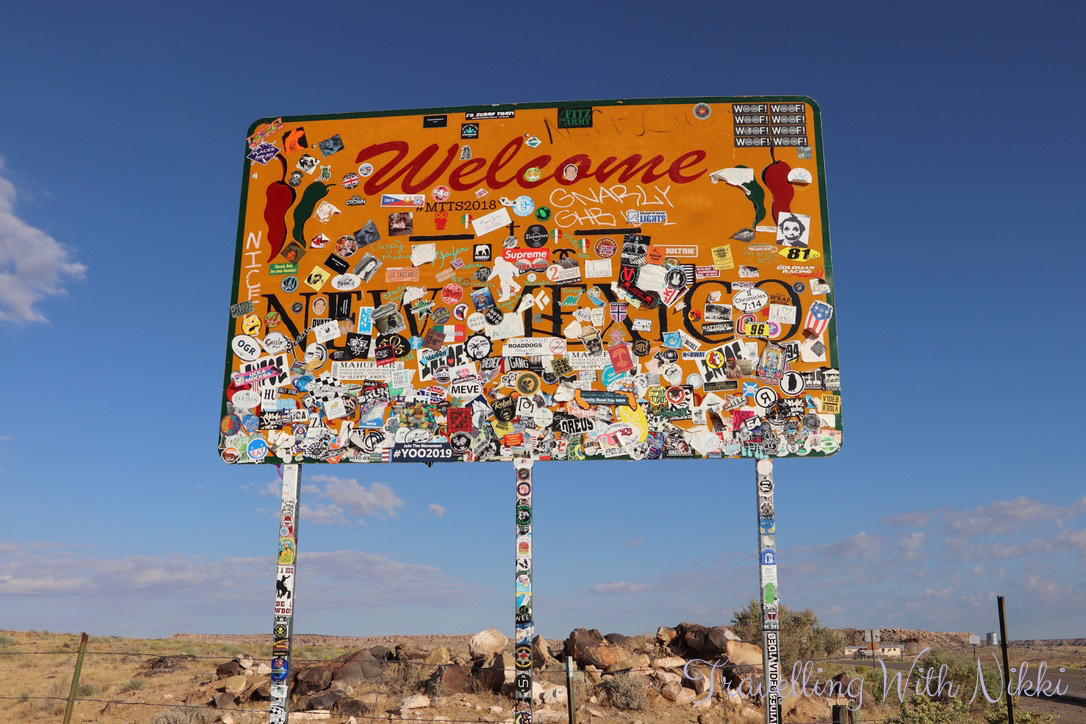 As you turn into the entrance of the Four Corners Monument, you will see what was once a New Mexico state sign. Unfortunately it has been vandalised and destroyed by pathetic idiots with stupid stickers beyond recognition. However if you’re like me and take photos of all the different state signs, there is another New Mexico state sign (that has not been vandalised) ten miles away on the US-64 past Teec Nos Pos.