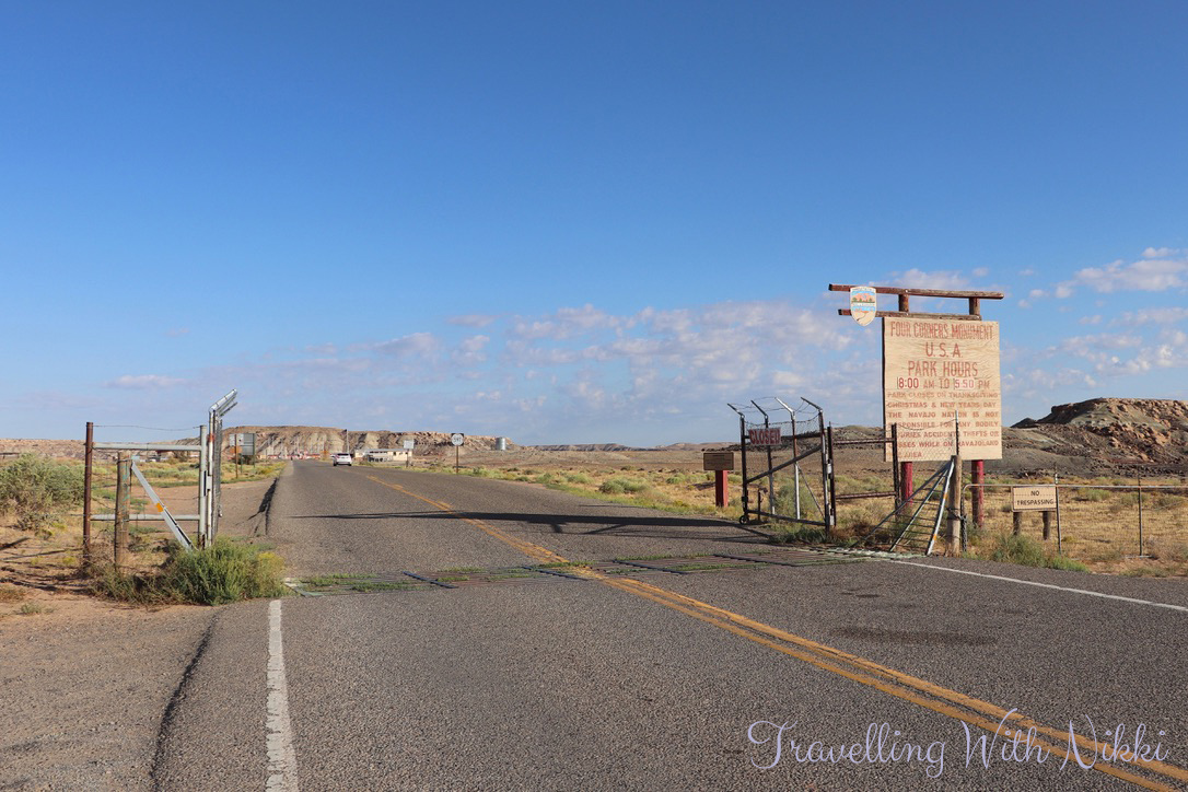 We left our hotel at 6:45am and was treated to a beautiful sunrise close to Monument Valley before driving 78 miles to the Four Corners Monument near the town of Teec Nos Pos and we arrived at the gate at 8:00am. If you need to use Google Maps for directions, make sure to load them using your hotel wifi before you leave as we did not have any mobile signal for over twenty four hours from when we left Tuba City the previous day until we reached Moab in Utah later that afternoon.
